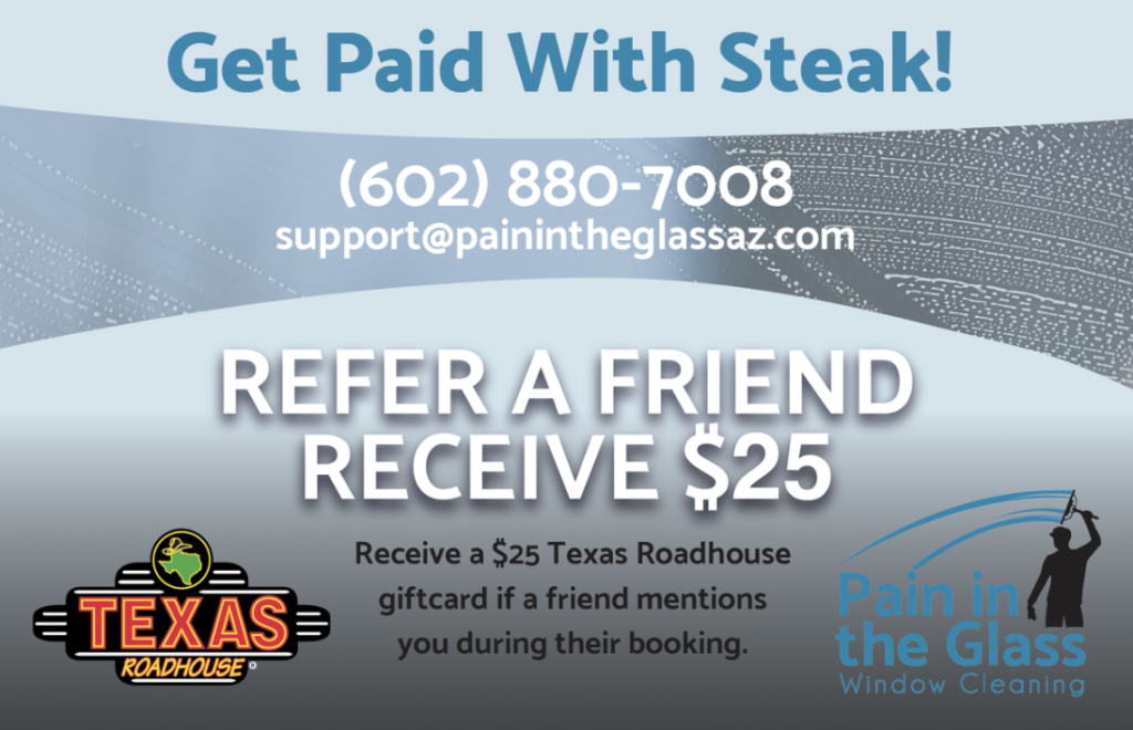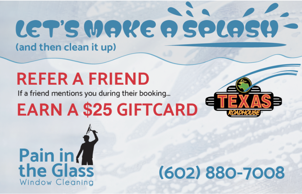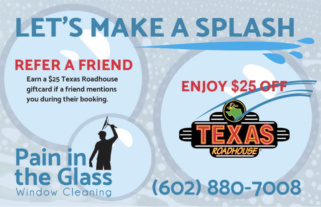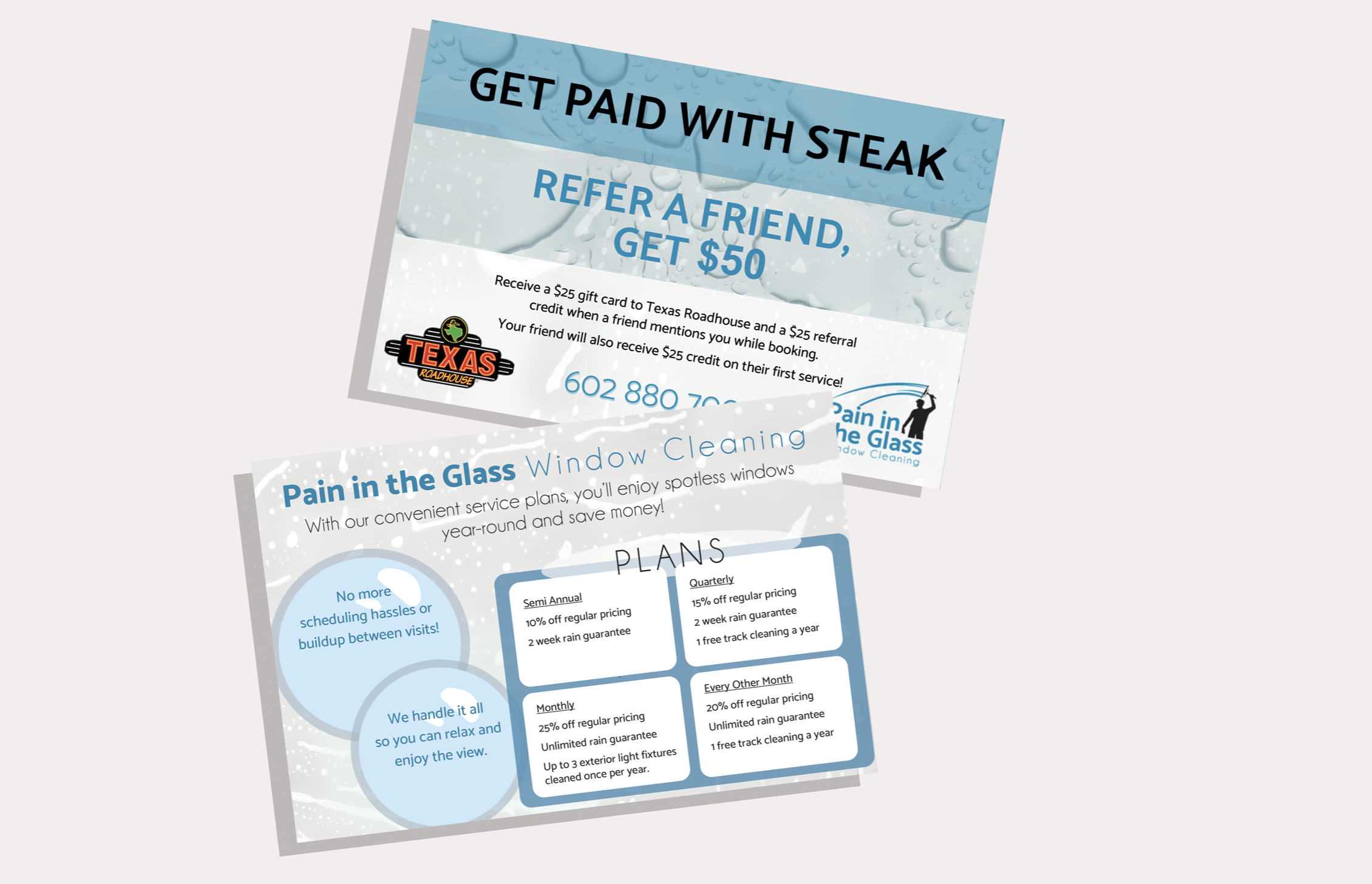 Pain in the Glass is a window cleaning service based in Queen Creek, Arizona. As a project for Phoenix Moirai, they wanted postcards to leave door to door to promote their services and draw more clients in. They wanted the front to include their service plan options, and the back to show a current promotion they had with Texas Roadhouse